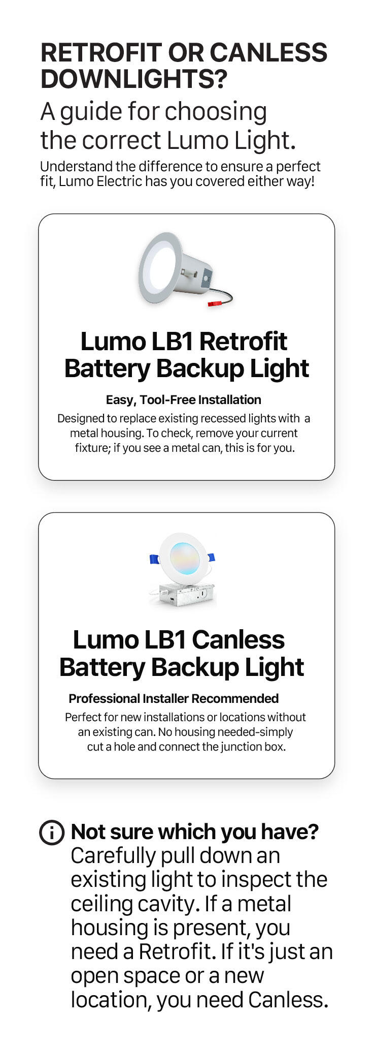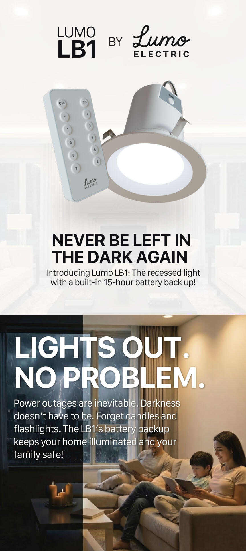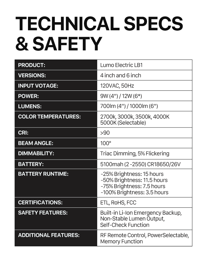 Introducing the Lumo LB1!The Lumo LB1 is a fully integrated, recessed LED fixture that serves as your powerful everyday light source and your automatic emergency backup. It installs like any standard downlight, but houses a long-life battery system designed to dramatically surpass current standards.Key features that matter:15-Hour Runtime: The LB1 is engineered to provide continuous, usable light for a full 15 hours during a power outage—a critical leap beyond the typical 90-minute industry requirement.Remote Control Functionality: Maintain control over your emergency power. The included remote allows you to manually switch the backup light on or off to conserve battery life across multiple units.Zero-Footprint Safety: The entire battery and control system is housed within the fixture, eliminating the need for plug-in lanterns or visible, unsightly emergency units.Get notified and join our community to be the first to secure the Lumo LB1. Stay safe, stay lit, and stay in control during any outage.