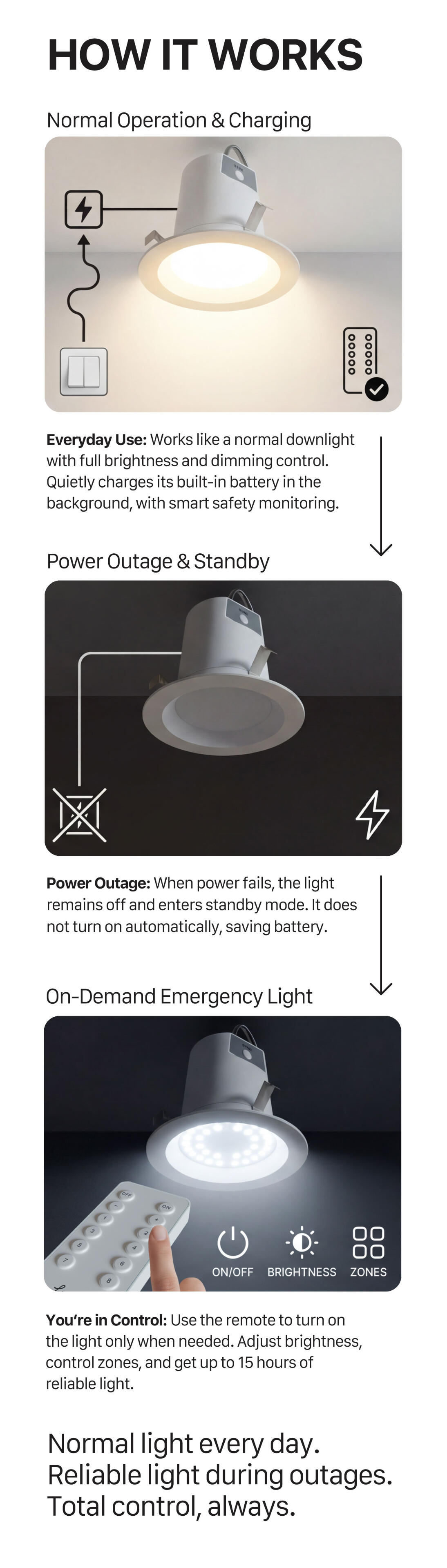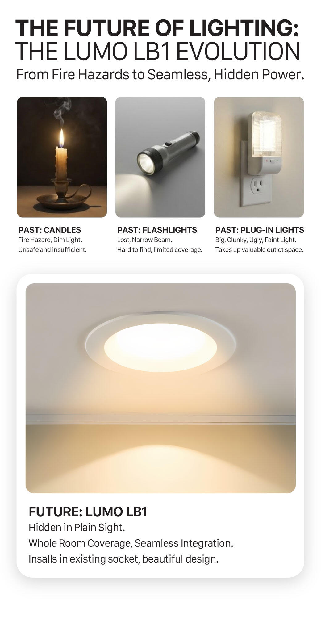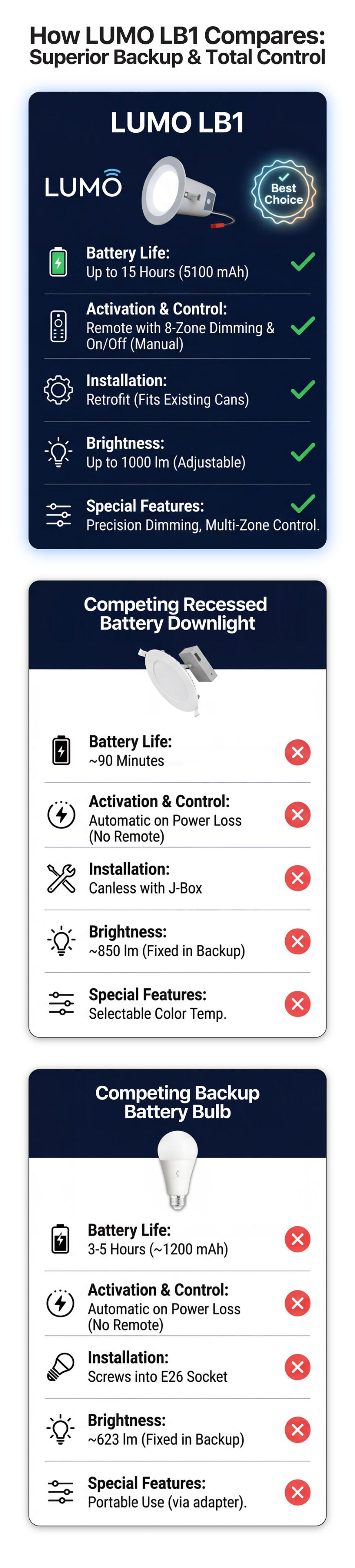 Introducing the Lumo LB1!The Lumo LB1 is a fully integrated, recessed LED fixture that serves as your powerful everyday light source and your automatic emergency backup. It installs like any standard downlight, but houses a long-life battery system designed to dramatically surpass current standards.Key features that matter:15-Hour Runtime: The LB1 is engineered to provide continuous, usable light for a full 15 hours during a power outage—a critical leap beyond the typical 90-minute industry requirement.Remote Control Functionality: Maintain control over your emergency power. The included remote allows you to manually switch the backup light on or off to conserve battery life across multiple units.Zero-Footprint Safety: The entire battery and control system is housed within the fixture, eliminating the need for plug-in lanterns or visible, unsightly emergency units.Get notified and join our community to be the first to secure the Lumo LB1. Stay safe, stay lit, and stay in control during any outage.